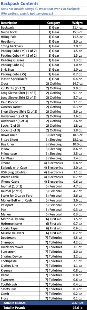 That’s a grand total of… 266 ounces which equals 16.6 pounds. Looks like I’ll make it. (For those of you obsessed with details, an itemized list of the expected contents of my backpack can be found below.)