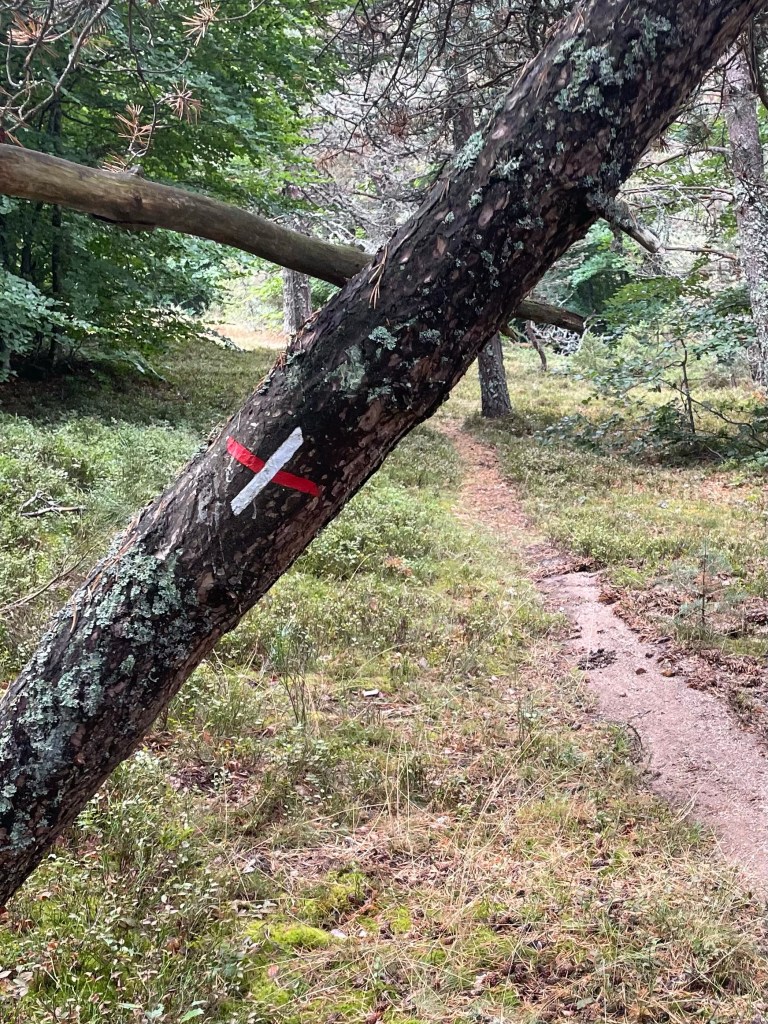 The trail is well marked. Every few hundred yards there are red and white markers confirming you’re on the trail. At turns the red and white lines point left or right. (See photos below.)