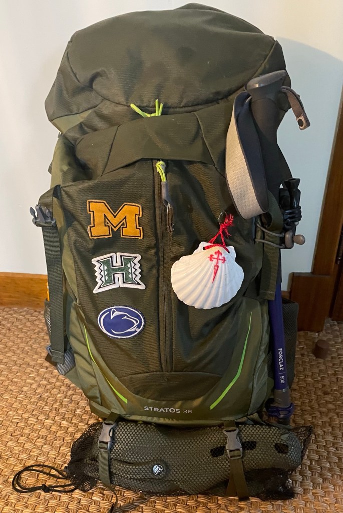 My backpack with the scallop shell I received from the Michigan chapter of the Americans on the Camino Association.