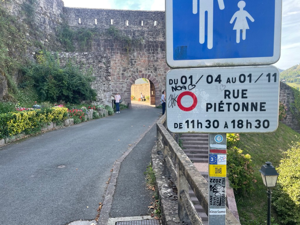 The last red and white flag on the trail. The gate to town marks the end of the French trail (although we’re still a few miles from Spain). New trail starts in town.