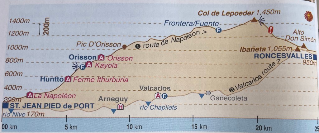 There are two routes. The lower Valcarios Route that was used by Charlemagne and is open all year long. And the upper route that was used by Napoleon (to surprise the enemy). The Napoleon Route is closed in winter or when weather is bad. Most pilgrims take the Napoleon route because of the great views. That’s the route I’ll take.