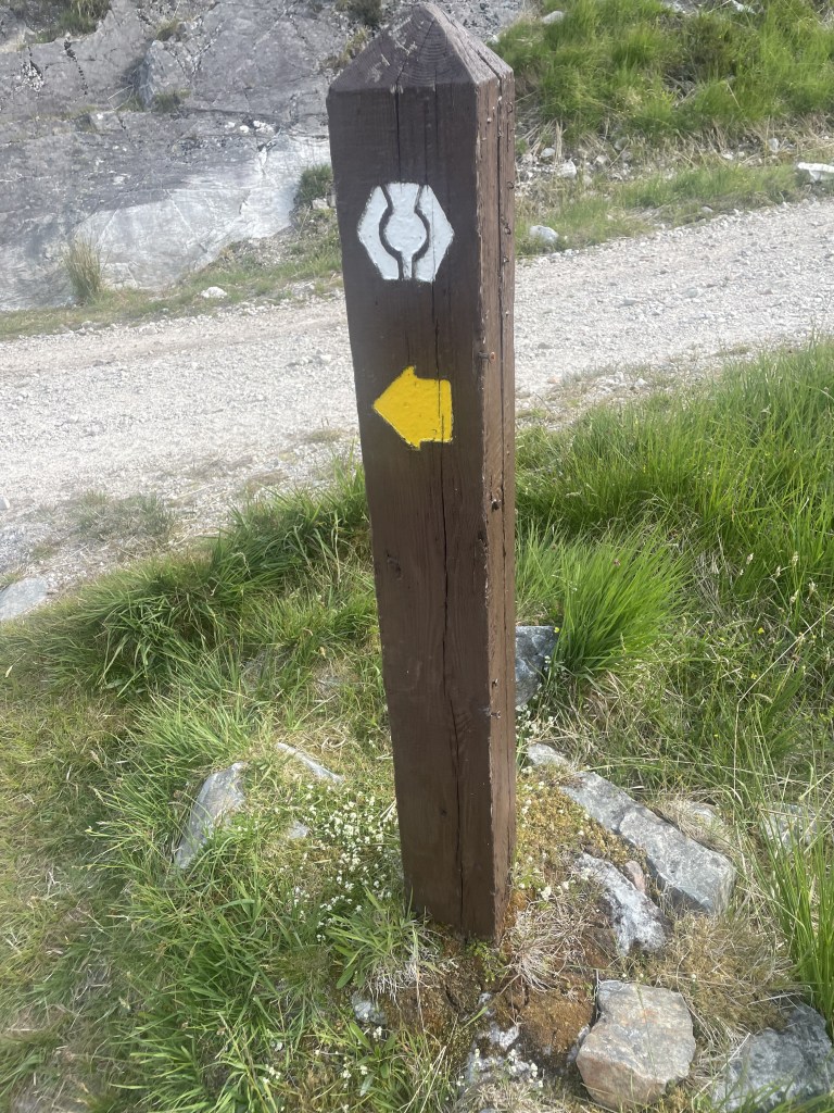 The trail is easy to follow, and where it does make a turn, sign posts are present. The white icon is the logo of the WHW. The yellow arrow indicates a turn, and reminded me of all the yellow arrows that mark the Camino in Spain.