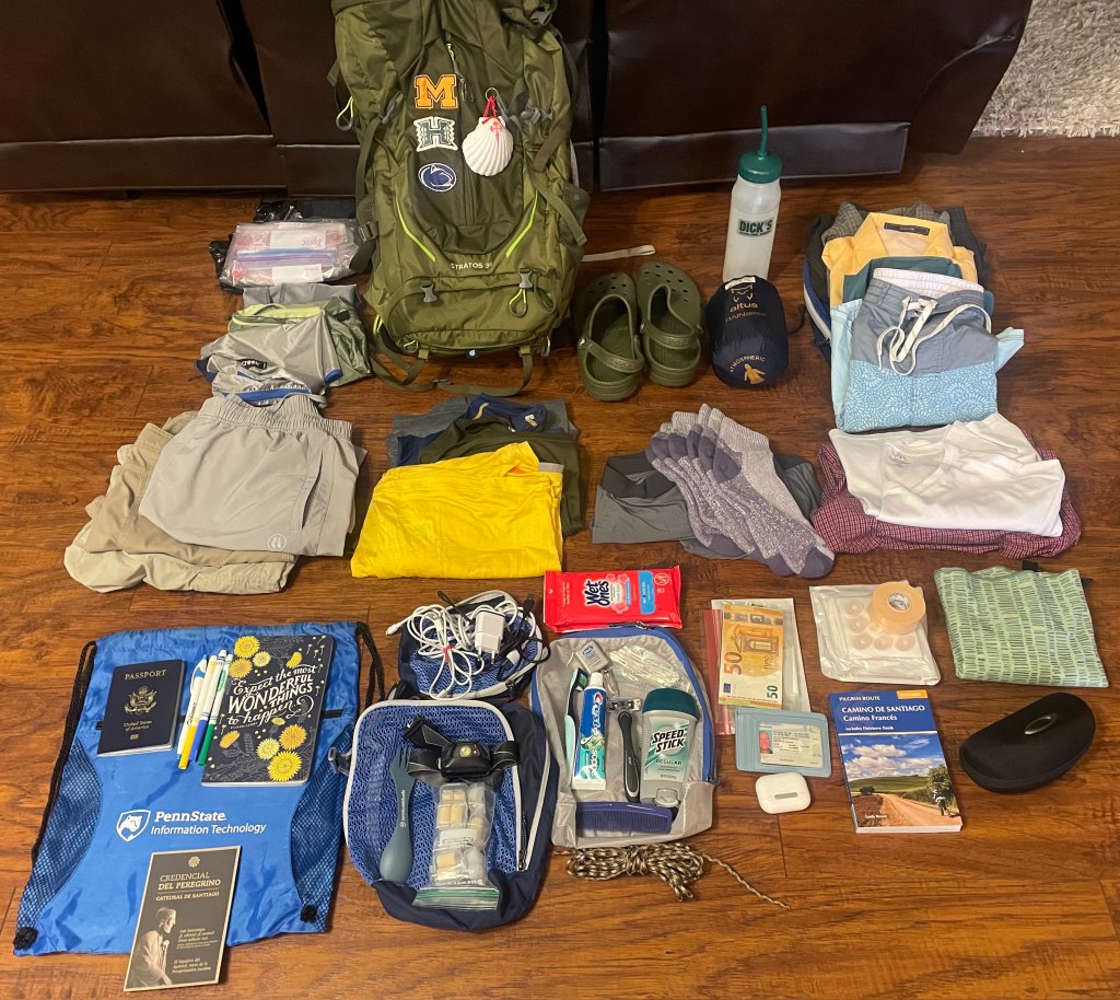 The traditional and obligatory backpack contents photo. This year I’m carrying less than last year. No sleeping bag, liner, pillow, foam roller or Gortex jacket. I need to carry a swimsuit and extra clothes for our Greece vacation, but even so, my pack will be about a pound lighter than last year. (Not pictured: shampoo, sunscreen, scissors. I’ll buy those in Europe since I can’t carry them on the airplane.)