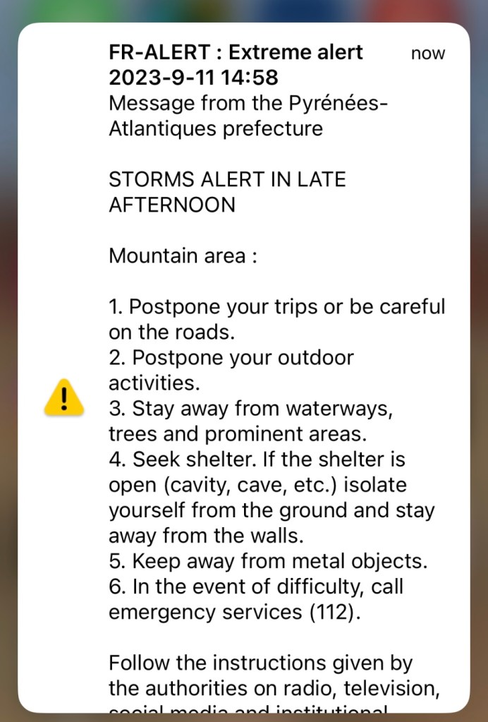 At about 3:00pm, everyone’s phones in the whole city started alerting loudly. Skies were (and are) perfectly clear. No wind. No sign of rain clouds. There is a chance of storms later tonight but using the warning system for that seems like major overkill. (Original alert was in French, but then a second one in English was posted.)