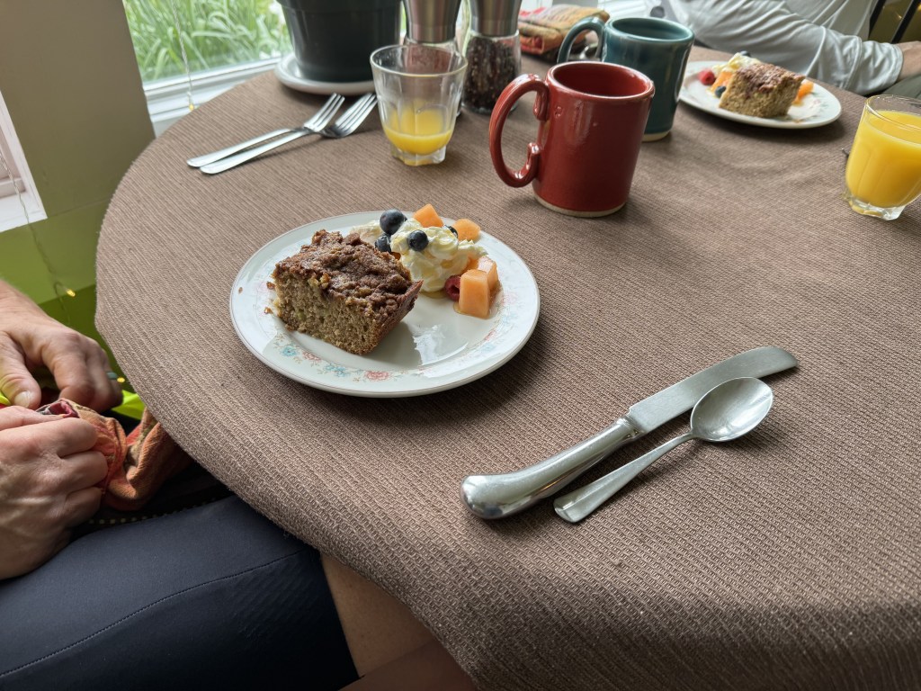Today, we all started our day with a tasty breakfast at our B&B. While all the walkers were dressed for the road, Mary and Shirley enjoyed breakfast in their comfy robes. They are quickly adapting to the B&B life.