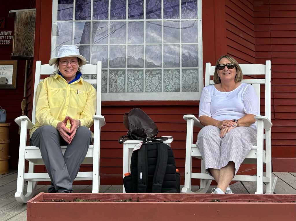 Maryann and Mary relaxing on the porch of the Vermont Country Store.