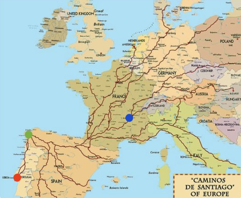 This year, I’ll walk from the red dot (Lisbon, Portugal) to the green dot (SdC). This is called the “Camino Português” and is the second most popular Camino route.
