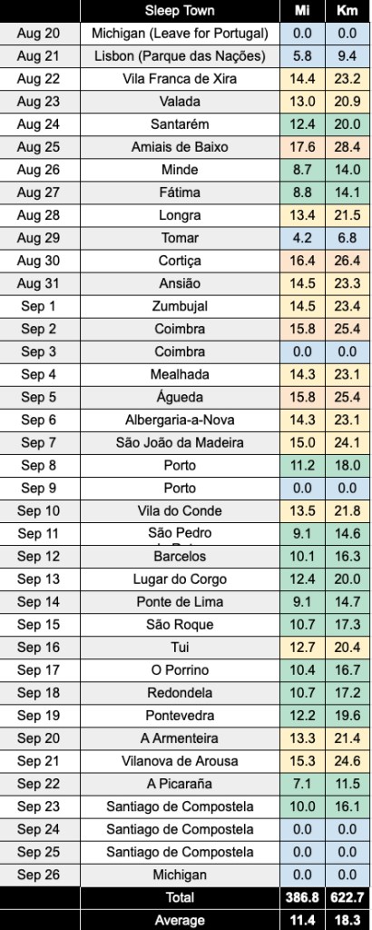 My specific route can be found in the table below. Ideally, I like to walk about 12-15 miles per day with a rest day sprinkled in every week or so.