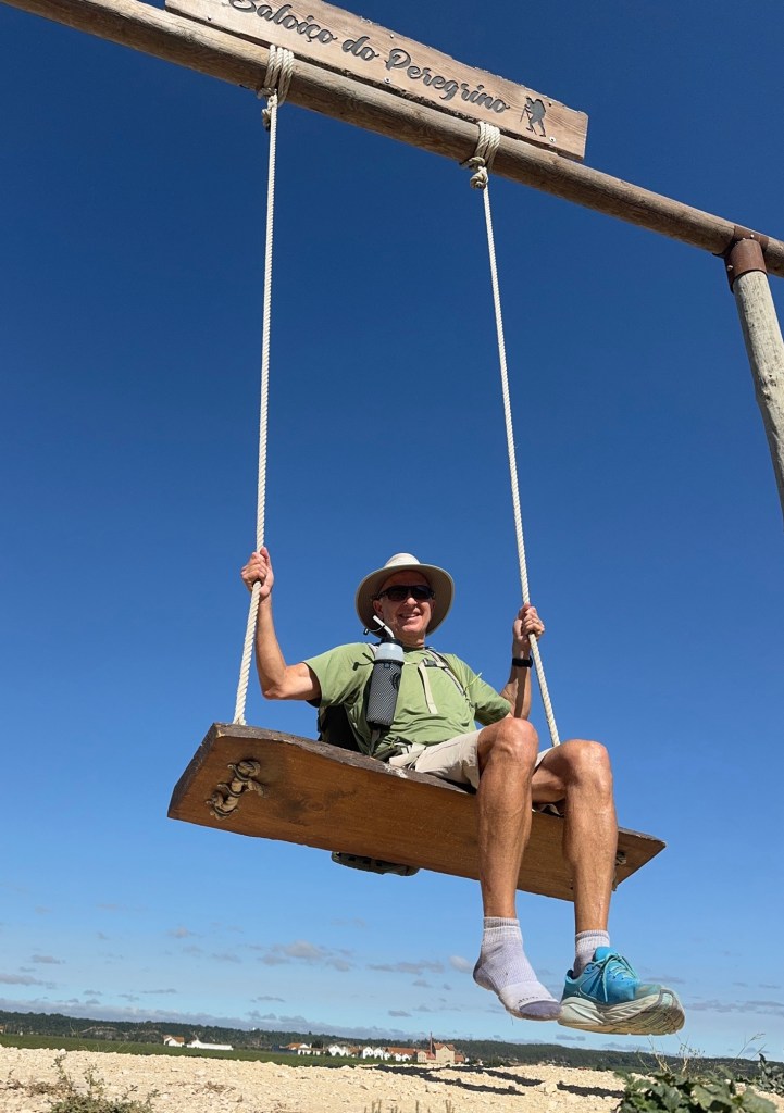 It was a quiet walk with little traffic. I saw a few cars and a few bikes, but no pilgrims. There was a swing for pilgrims, so I gave it a try. Used my shoe for the selfie stick.