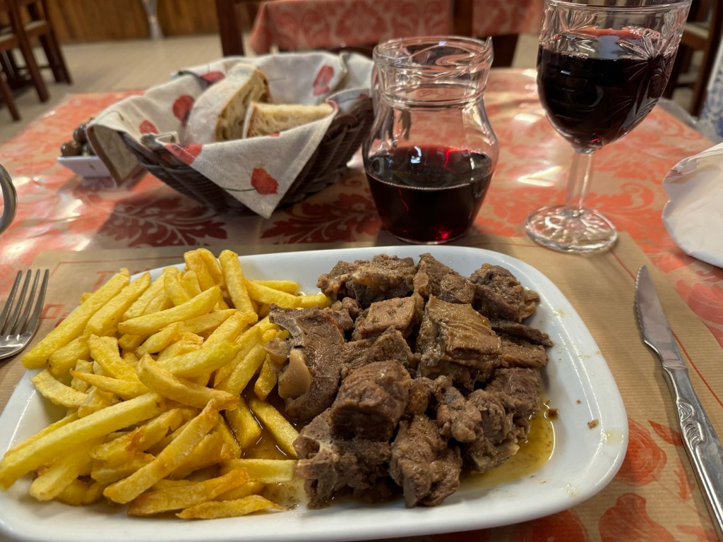 Last night after I posted on my blog, I finally got dinner. It was quite an experience. The owner said “you like meat?” And “beer or wine?” I said “yes” and “wine,” and shortly afterwards a full meal was in front of me. I was famished, and it tasted great.