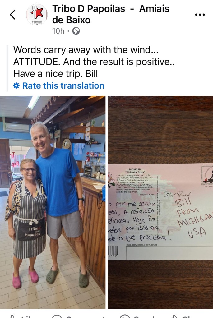 Afterwards, I gave her a postcard with a thank you written in Portuguese. She made a big show of it, took my picture and the bartender gave me a souvenir (a ribbon from the restaurant to hang on my backpack). He was impressed that I was from “Detroit” because apparently Detroit is known for techno-music. Someone needs to introduce this guy to The Temptations.