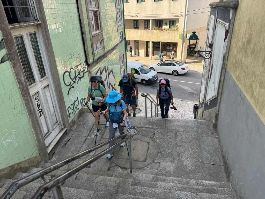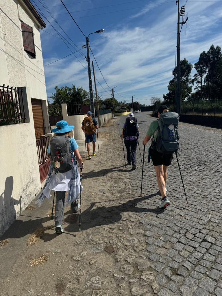 One of the challenges with poles is getting them to Europe. You can’t carry them onto planes, although sometimes people sneak them through. This time, TSA confiscated Tess’ and Rory’s poles, but Cyrene carried hers on without incident. Karen checked hers, but a lot of pilgrims don’t like to check their backpack, because losing it would be a major setback for their Camino. Many pilgrims buy them when they get here, then donate them or check them when they head home.