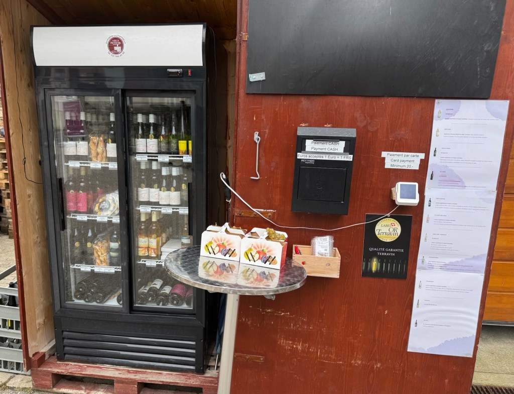 A self-service wine dispenser. Leave some cash, take a bottle of wine. They even have a cork-screw and plastic cups for your use. If we had this in the USA, we’d have a lot more walkers.
