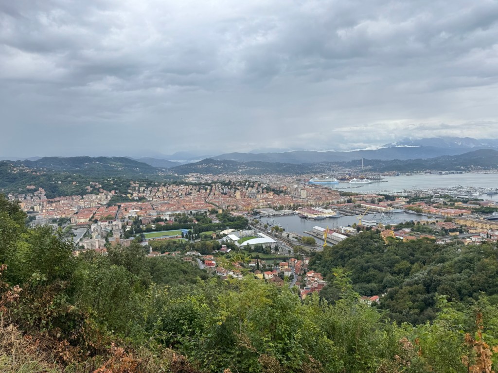 La Spezia, the Mediterranean and the Apennine mountains. Some snow can be seen on some of the mountains. That might be from the recent cold and wet spell.