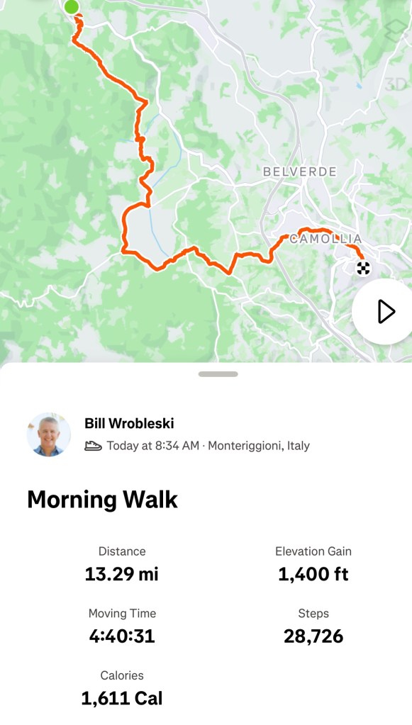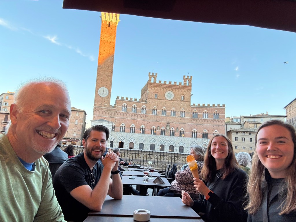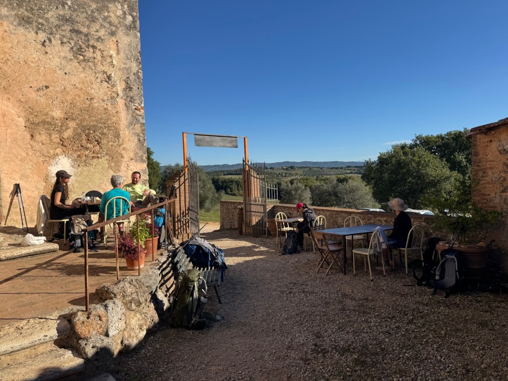The view of Monteriggioni as we left this morning. We all loved this beautiful village. If you’re ever in Tuscany, check it out. Peter walking ahead. Despite a hip injury, he did great walking the entire week. A fun pilgrim stop. The trail isn’t as busy as the Camino in Spain, but this section of the trail does have a bunch of pilgrims. Abbey and Kyong walked together a lot the last two days. They’ve kept each other entertained. Rome is getting closerLast aperitivos. This time in Siena’s iconic Piazza del Campo. Last supper. Liliane (Arielle’s mother) joined us. They’ll be vacationing together for the next two weeks. Last gelato. I’m blessed with an amazing family. I’m so thankful they took the time to join me on this pilgrimage. Pizza with bologna and fries. Really. More pizza. We were hungry after walking. Tagliolini with truffles. This was simple but fantastic. One of my favorites. Bistecca alla Fiorentina