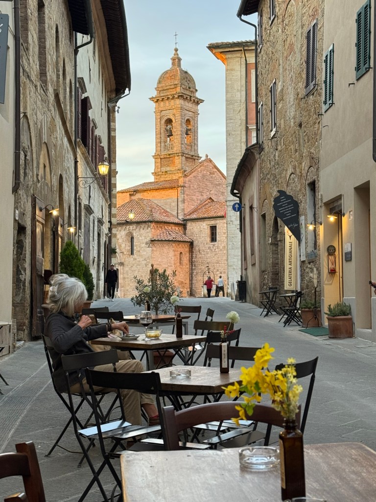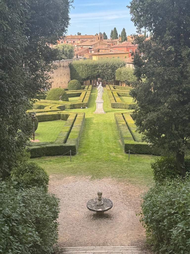 Montalcino in the distanceI saw many signs for vineyards and wine tastings throughout the dayCypress trees are seen all over TuscanyNearly every large estate features cypress trees up their driveI had lunch in Torrenieri which is visible in the distanceSan Quirico d’Orcia is one my favorite towns that I’ve visited so far. Pictured: the view from our table.Some of the San Quirico d’Orcia’s ancient wallsThese gardens in San Quirico d’Orcia date back to 1561