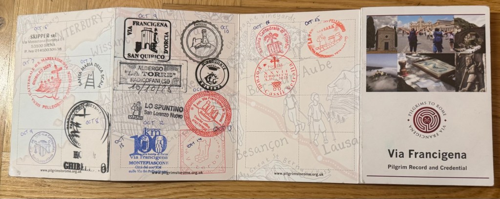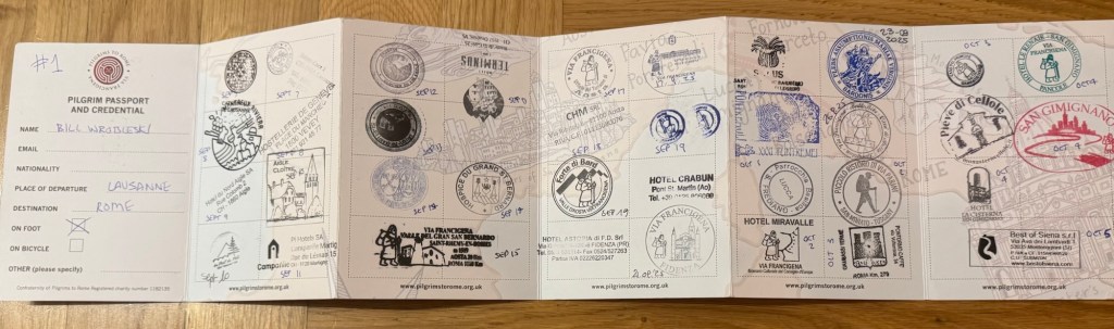Pilgrim’s passport. I’ll get my last stamp at St. Peter’s tomorrow.